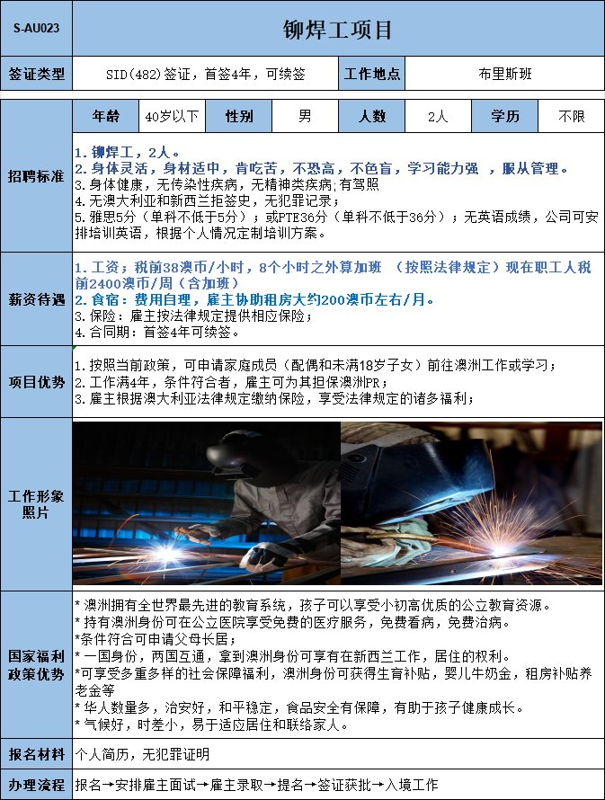 鉚焊工,2人。稅前38澳幣/小時(shí),8個(gè)小時(shí)之外算加班 (按照法律規(guī)定)現(xiàn)在職工人稅前2400澳幣/周(含加班)