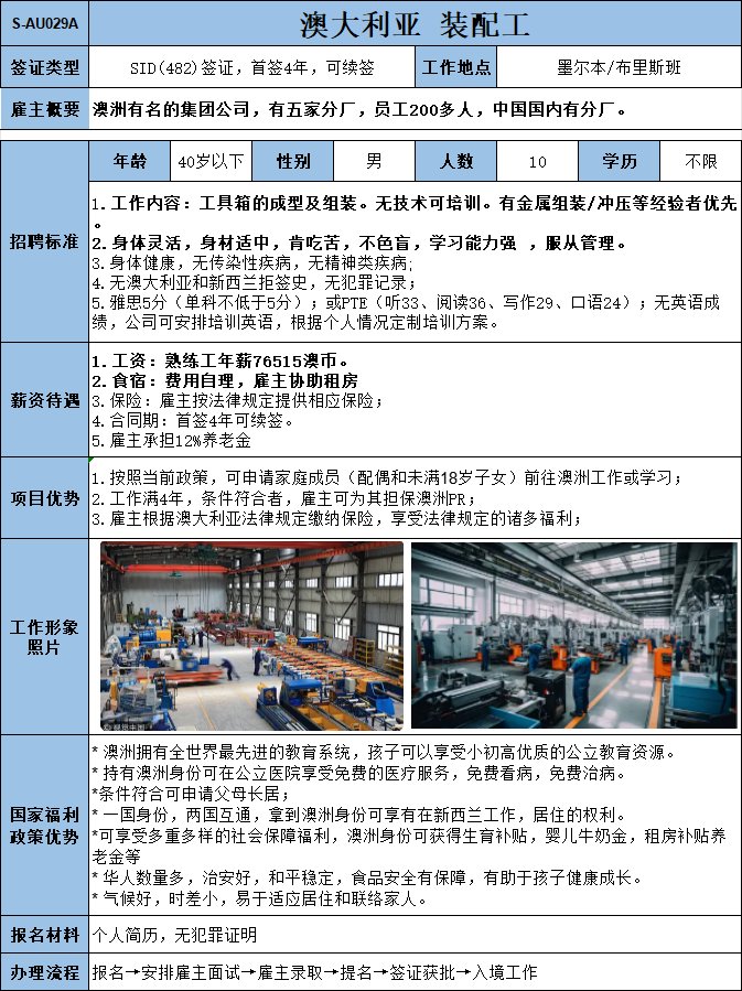 鉚焊工,2人。稅前38澳幣/小時(shí),8個(gè)小時(shí)之外算加班 (按照法律規(guī)定)現(xiàn)在職工人稅前2400澳幣/周(含加班)