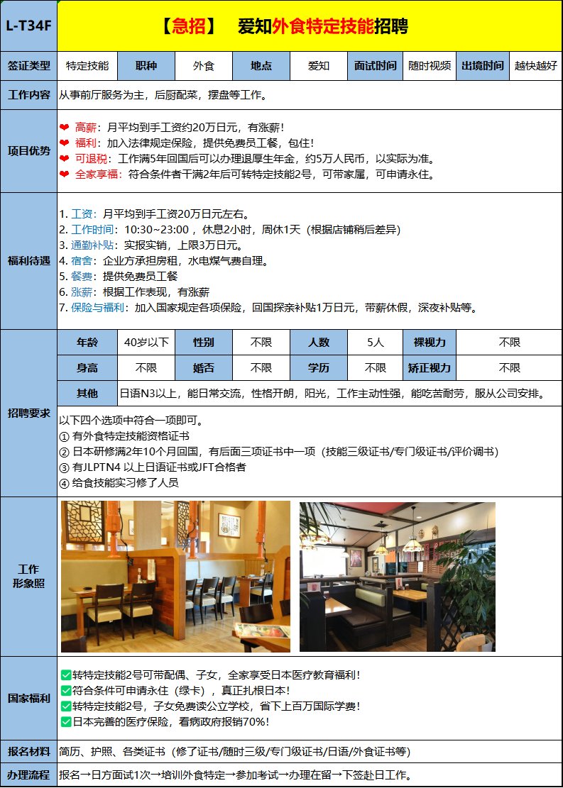 主要負責(zé)前廳服務(wù)和后廚幫廚(煮面,洗菜、配菜、清洗餐具)。免費提供工作餐,有獎金,有漲薪機會?;貒罂赏撕裆杲?。符合條件者干滿2年后可轉(zhuǎn)特定技能2號,可帶家屬,可申請永住。