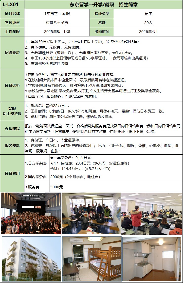 首期費(fèi)用低,只需支付6個(gè)月住宿費(fèi)+1個(gè)月學(xué)費(fèi),約2萬(wàn)人民幣;后期學(xué)費(fèi)分期付款,每月交一次學(xué)費(fèi)6萬(wàn)日元;1年留學(xué)后可根據(jù)個(gè)人意愿,升學(xué)或就職,學(xué)校提供就職崗位;