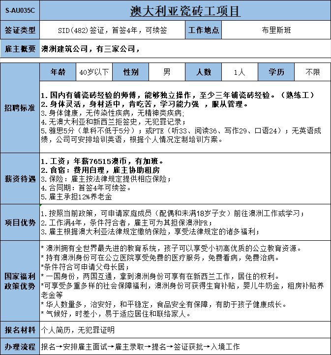 實(shí)力公司,主營家居建材,主要負(fù)責(zé)鋪設(shè)瓷磚、地板,1年以上相關(guān)工作經(jīng)驗(yàn);年薪73150澳幣,多勞多得,工資漲薪潛力極大