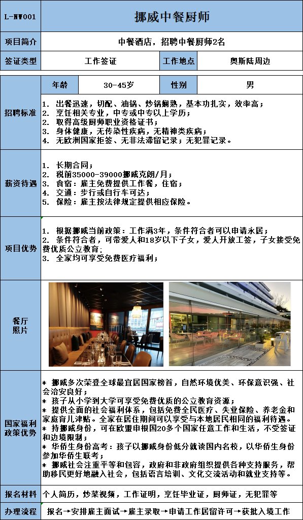 要求47歲以下、男性、高級(jí)廚師證、菜系不限,可獨(dú)立完成廚房全般工作,如烹飪、備貨、衛(wèi)生.稅后23000挪威克朗/月以上,有度假金