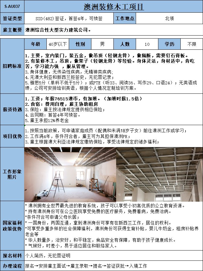 實力公司,主營家居建材,主要負責鋪設(shè)瓷磚、地板,1年以上相關(guān)工作經(jīng)驗;年薪73150澳幣,多勞多得,工資漲薪潛力極大